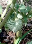 Erect or sprawling annual or short-lived perennial herb or small shrub, up to c. 2 m. Branches often purple-tinged, softly pubescent and more or less glandular; all parts unpleasantly scented. Leaves alternate, more or less broadly ovate to elliptic, up to 17 × 9.5 cm, thinly textured, pubescent, particularly near the base below, on the veins and the margin; base often decurrent into the petiole; margin with coarse to almost lobe-sized triangular teeth. Flowers solitary in the forks of the branches, erect when fresh, later drooping. Calyx long and tube-like, up to 11.5 cm long, sometimes purplish and somewhat swollen towards the base, 5-angled with ovate to linear-triangular unequal apical lobes, up to 2.5 cm long. Corolla white or creamy, sometimes purple-tinged, 13-21 cm long, trumpet-shaped, somewhat 10-12-lobed with acuminate tips. Fruit nodding to pendulous, almost round to ovoid, up to 6 × 5.5 cm (including spines), covered with numerous slender spines, 8-12 mm long, purple-green to brownish when ripe, breaking up irregularly. All parts of the plant are poisonous. |