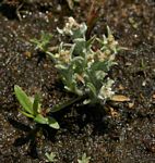 Annual herb, branching from the base, up to 25 cm tall but often flowering when only a few cm tall. All parts more or less densely covered in white cobweb-like wool. Leaves sessile or shortly petiolate, spathulate, 1-7 cm long, mucronate at the apex; margin entire. Inflorescence in a terminal spike with leaf-like bracts. Involucral bracts c. 3-seriate, oblong, c. 2 mm long, pale buff or purple-tinged. Florets small, numerous, whitish. |