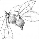 Small tree with a cracked reddish bark. Leaves opposite but sometimes appearing 3-whorled, oblanceolate, elliptic or obovate, 9-30 cm long, leathery, hairless above, sometimes slightly pubescent beneath; domatia usually present; petiole 3-15 mm long, more or less velvety.; stipules 3-angular, long acuminate, 4-5 mm long. Flowers in terminal, 3-17-flowered inflorescences, pendulous, sweetly scented. Corolla white with red-purple spots at the throat, golden velvety outside; tube 4.7-7.2 cm long, shortly cylindric and bell-shaped above widening up to 4.7 cm at the mouth; ovate, up to 3.5 cm long, whitish hairy inside. Fruit globose to ellipsoid, 2-4.6 cm long, rust-coloured, flaking, calyx limb persistent at the apex. |